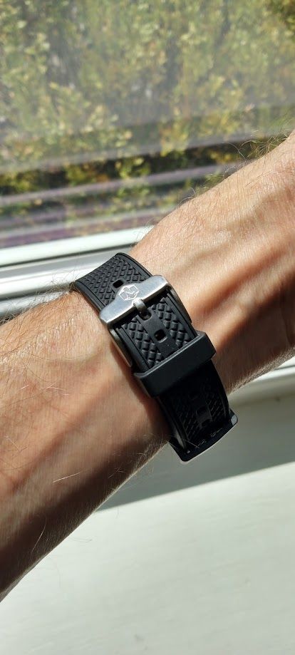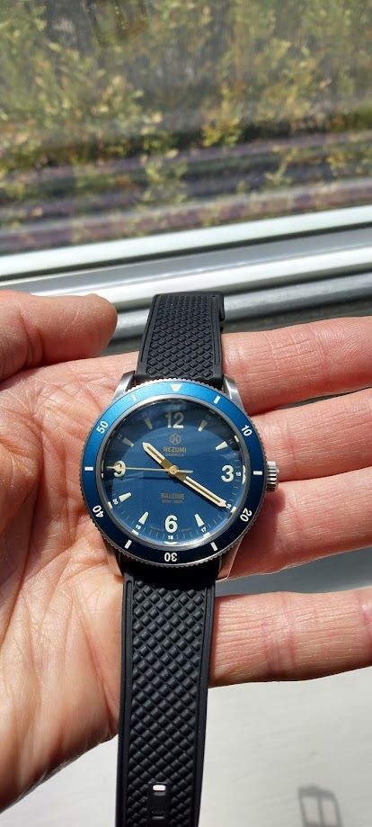 Plus: Beautiful blue dial and bezel. Proper no-date movement (Miyota 9039). Very nice embossed caseback. Comfortable and attractive rubber strap.
